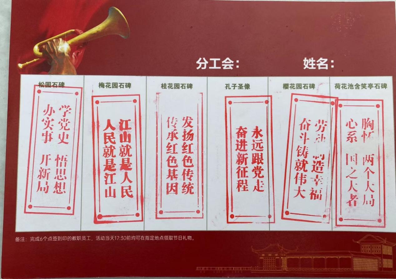 14:30,七名教职工身穿运动服在综合楼前坪汇集并领取签到卡,随后,在欢声笑语中一同出发,步行到分布在校园各处景色优美的签到处:桂花园石碑处、梅花园石碑处、杜鹃园石碑处、孔子圣像处、樱花园石碑处、荷花池含笑亭石碑处分别盖签到印。最后凭着盖满六个印章的签到卡到综合楼一楼大厅兑换纪念品。