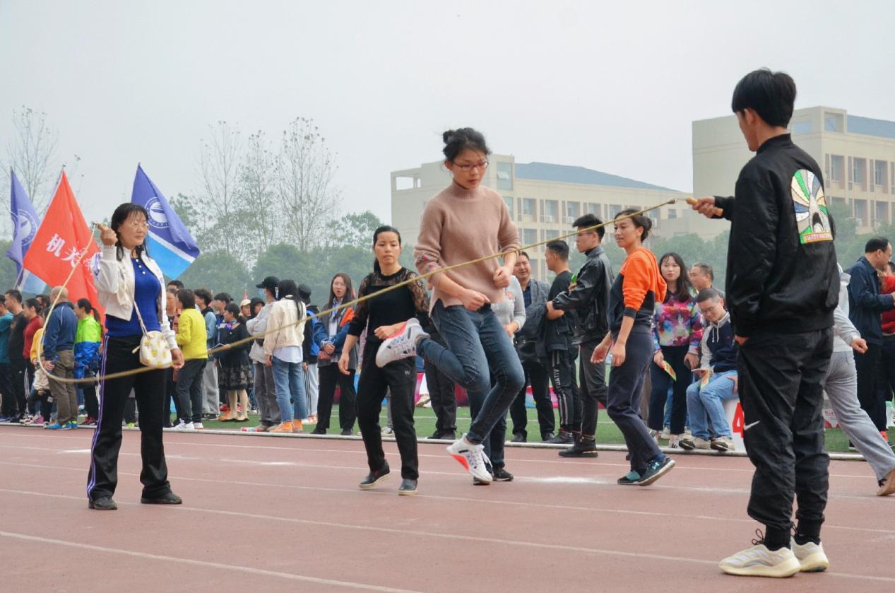 第二个项目是“同心协力”。两人摇起长绳,六人轮番上阵跳绳,在两分钟内成功跳绳次数最多的队伍获胜。随着裁判的一声令下,两位教职工开始有节奏地摇绳,一位又一位老师跨过绳子,她们很快找到了熟悉的默契感,灵敏而快捷的完成了一次次的动作。
