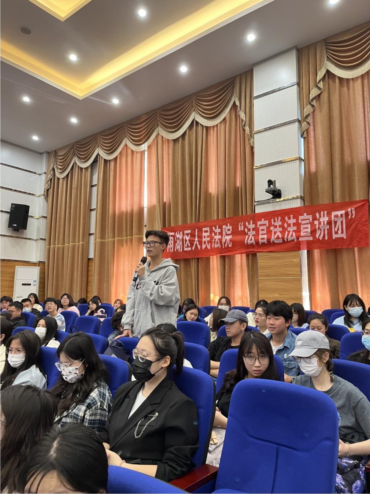 接着,在向明老师的主持下,雨湖区人民法院“法官送法宣讲团”活动开始。雨湖区法院王庭长作为主讲人,简要点评了本次案件,详细梳理了该案法学知识点,耐心回答了同学们的提问,为同学们上了一堂生动形象的法治课程。王庭长借这次法制宣讲活动也告诫同学们,作为法科生更要树立法治意识,考虑自己行为的后果。