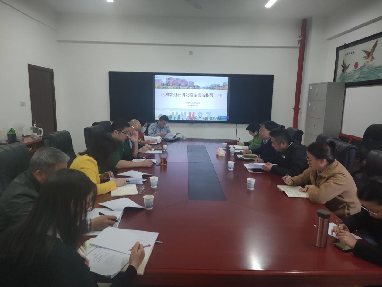 3月15日下午,我校社科处贺胜兵处长、段斌副处长等一行来bevictor伟德官网调研交流科研政策、科研项目进展等工作。院长邱帅萍教授、副院长宋智敏教授、吴四江副教授、徐金燕副教授、易卫中副教授、雷连莉副教授、刘鄂副教授、雷勇副教授、李凤翔副教授等参加调研座谈会。