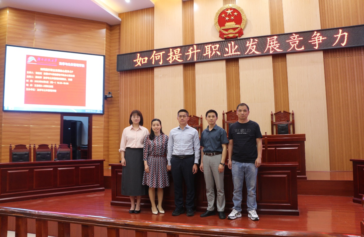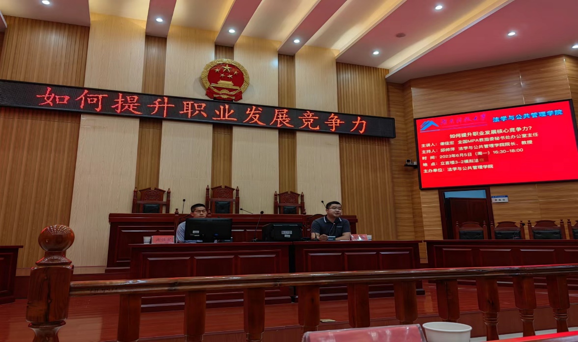 报告会第二个阶段于下午4点半至6点在立言楼3-2模拟法庭进行,谢佳宏主任报告主题为《如何提升职业发展核心竞争力?》,学院院长邱帅萍主持,21级、22级全体公共事业管理专业、法学专业学生和部分教师参加。谢佳宏主任首先介绍了影响公务员职业发展的影响因素,提出个人潜能开发、成长需要满足和自我价值实现的个人职业成功内在驱动力,影响职业成功的因素主要有心理资本、人力资本、社会资本和组织赞助。其次,谢佳宏主任通过结合我国公务员队伍建设的实际情况,从党和国家对公务员队伍的要求、新时代公务员胜任力模型、结合自身实际的能力提升需求以及案例与访谈等方面,分析了影响公务员职业发展主要能力的相关内容;强调通过专业训练、借鉴京东能力卡片与721能力提升法,以及刻意练习等方式来提高自身职业能力的重要性。最后,谢佳宏主任总结了学历、能力、关系、政绩是影响公务员职业发展的主要因素,其中能力是关键,而政治能力、调查研究、沟通协调、学习能力等是公务员通用能力中的重点,建议学生结合自身实际,明确能力提升的目标和计划,加强理论与实践相结合,在不断学习与实践中提升和超越自我。