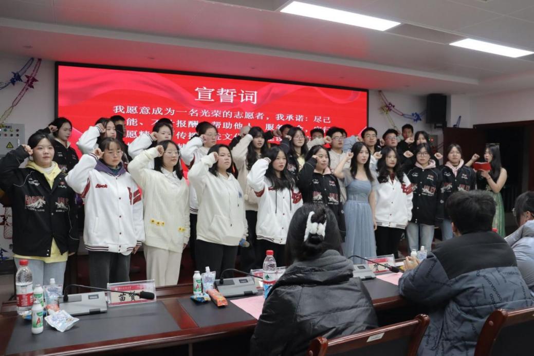 会上还举行了团旗交接仪式,这不仅仅代表着一个新起点,更是象征着一份重大的责任。交接完成后,三院委员们一起大合唱《骄傲的少年》并集体宣誓志愿者宣言,这慷慨激昂的声调表达了所有人的决心与斗志。