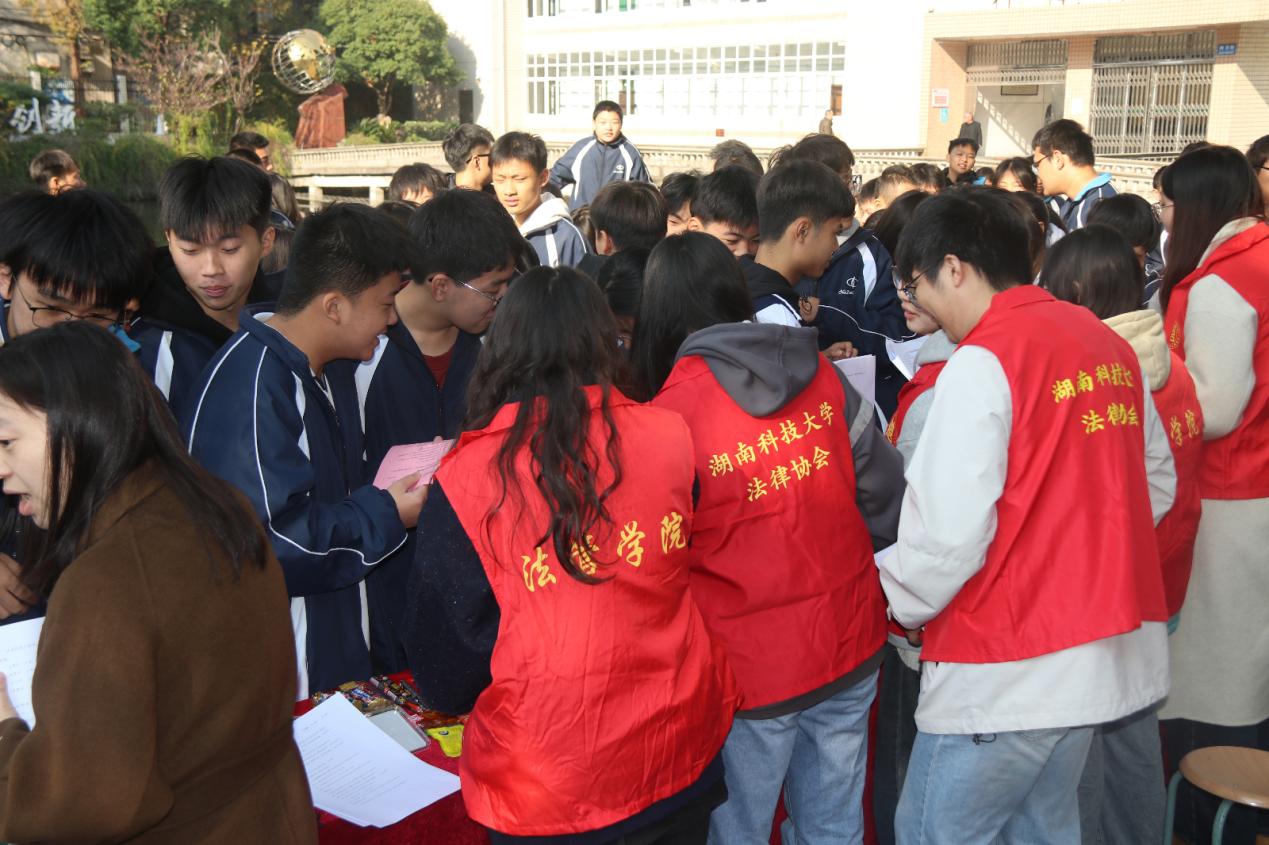 与此同时,法律协会的志愿者们在湘潭市第二中学喻老师的协助下,在校园主干道处开展摆点宣传,志愿者们穿着统一的服装,用通俗易懂的语言解释宪法的基本原则和公民的基本权利义务等宪法相关知识。
