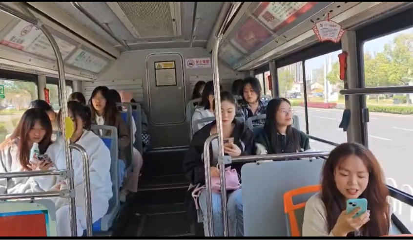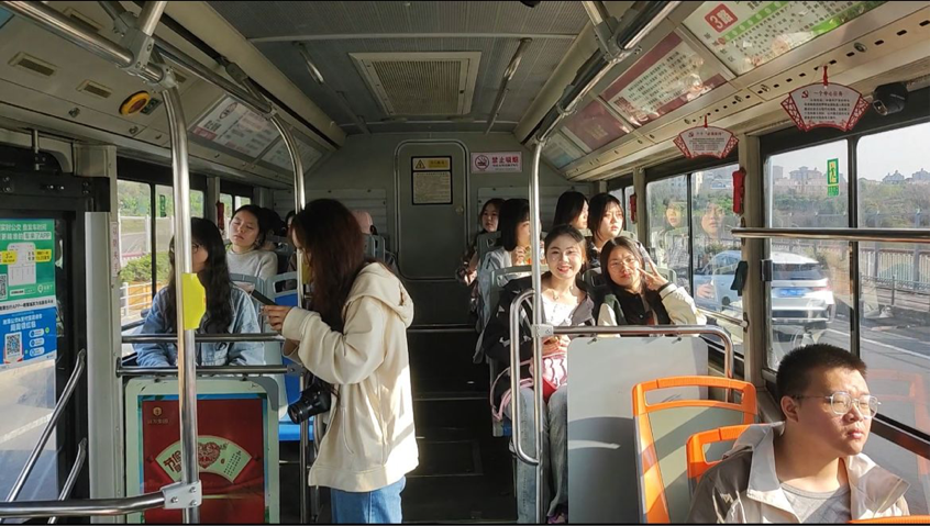 公交行驶途中,团支书李寒对本次活动的到场嘉宾、具体流程和注意事项等与同学们一一说明,虽然不在教室,但同学们依然聚精会神地聆听着团支书的讲解:从“求知--坚持四个自信”到“寻觅--红色博物馆”而后“互动--守人民立场”最后到“总结--回首与展望”,团活内容环环相扣,一方面使大家深刻领会此行的目的,另一方面也为同学们奠定了探索博物馆的情感基础。随着团支书讲解的结束,大家来到了振奋人心的合唱环节,在音响的“领唱”下,同学们逐渐克服心中的怯场,纷纷加入合唱的队伍,就这样,在一声声美妙的歌声中,我们抵达了目的地。