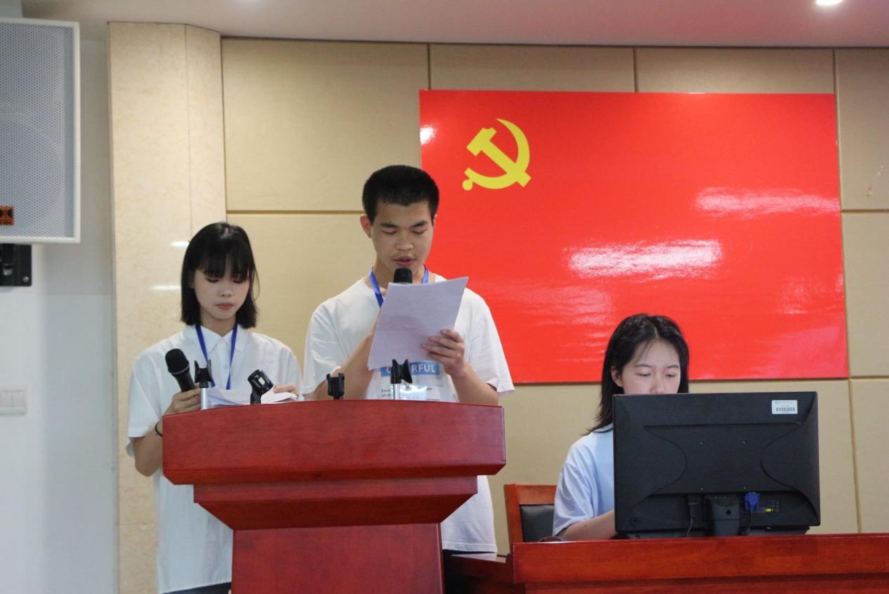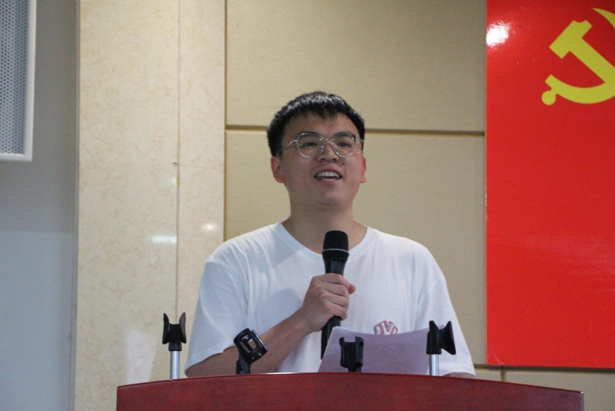 活动伊始,全体人员起立,奏响国际歌。随后,老师和同学们共同观看短视频《一句誓言 跨越百年》,视频里一代又一代共产党人为了“我志愿加入中国共产党……”这一句誓言,用青春、汗水乃至生命去奋斗,这使同学们感受到共产党人的初心如磐、奋楫笃行。随后,入党积极分子培训班学员代表俞宇泽发言,他以铿锵有力的声音向大家讲述中国共产党100多年光荣的发展历程,并提到两位在他成长中指引他前行的红色榜样——粟裕大将和他姐姐的事迹,这其中展现出的爱国主义精神和甘于奉献、攻坚克难的革命精神让同学们深刻地体会到中共党员全心全意为人民服务的宗旨。