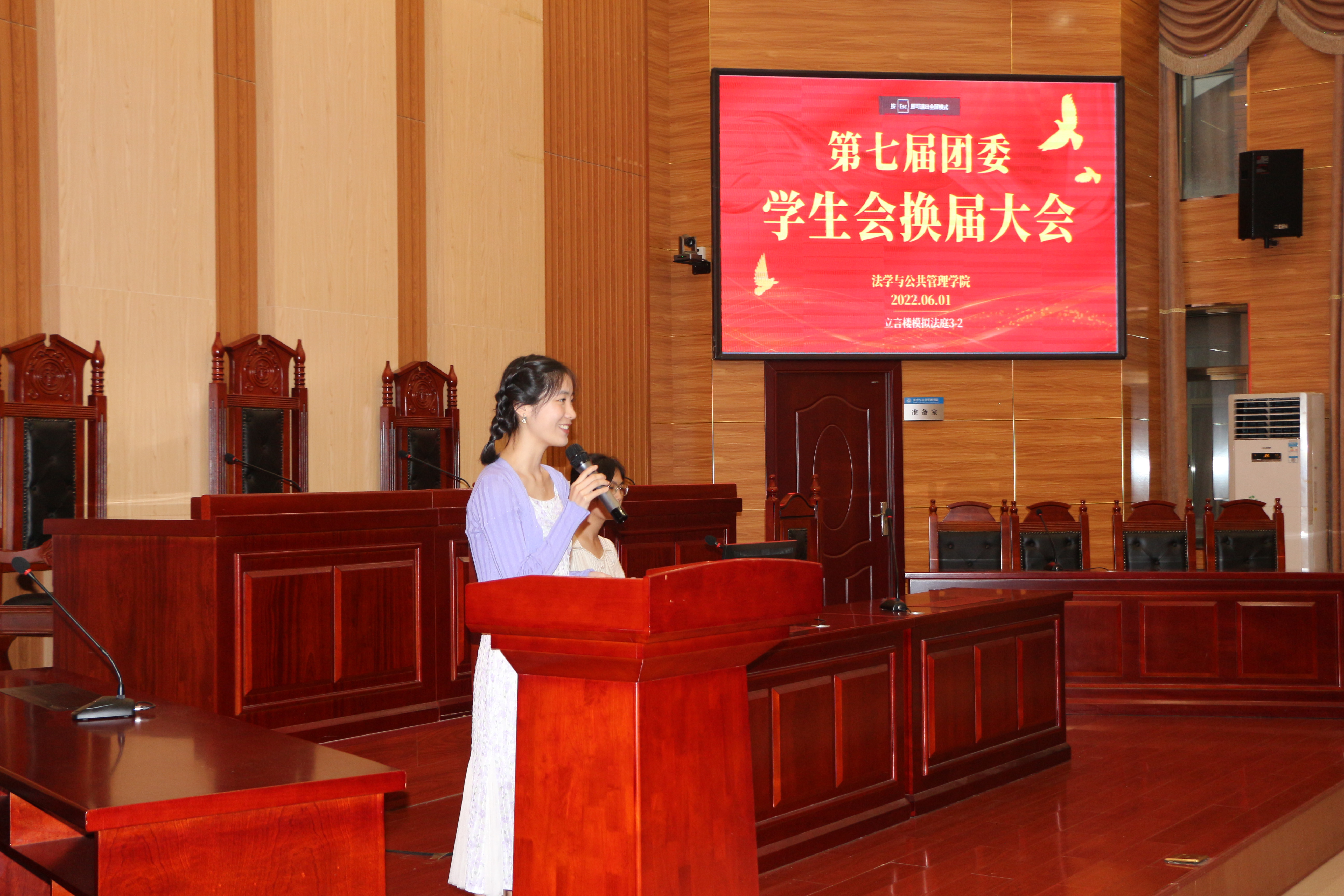为进一步推进学院学生工作的民主化、科学化、规范化,更好地发挥团委学生会的桥梁和纽带作用,实现其自我教育、自我管理、自我服务的职能,6月1日晚,bevictor伟德官网在立言楼3-2模拟法庭举行了第七届团委学生会换届大会。出席本次会议的有学院党委副书记叶军、学工办副主任郭志军、辅导员李斌、第六届团委学生会主要干部、学院19-21级各班学生代表。本次会议由第六届团委学生会团委第一副书记戴钰莹主持。