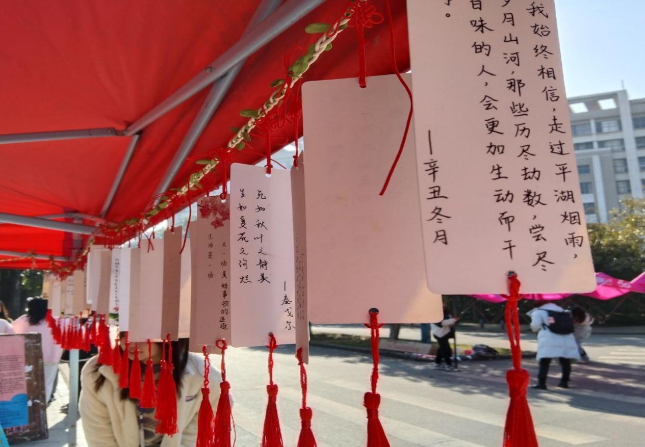 活动一经宣传,就引起了同学们的广泛关注。活动当天,来到摆点处的同学络绎不绝。同学们热情地在负责委员处领取卡片并写下心中最温暖人心的话语。活动期间,同学们积极参加,态度端正,感情发自内心,书写认真仔细。随风飘扬的写满鼓励话语的卡片也形成了一道亮丽的风景线。