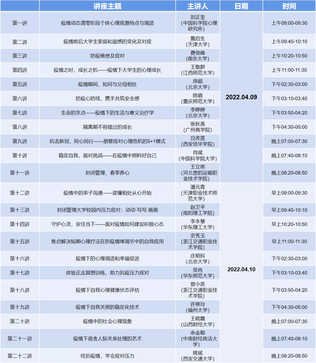 随着全国多地陆续发现多起新型冠状病毒肺炎确诊病例,各地纷纷实行封禁政策,在校大学生群体中出现诸多心理健康问题,因此,中国心理学会心理危机干预工作委员会及全国高校心理委员研究协作组织于2022年4月9-10日面向全国高校学生开展“抗击疫情全国心理委员大讲堂”系列公益讲座。bevictor伟德官网积极响应号召,组织各班心理委员线上观看本次公益讲座。