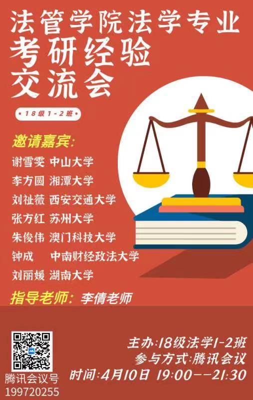 为帮助bevictor伟德官网2018级学生了解考研信息、掌握考研技巧,2021年4月10日晚上七点,由bevictor伟德官网18级法学一、二班主办的线上考研经验交流会在腾讯会议顺利举行。18法三法四和潇湘法学班的同学们也把握机会、积极与会。本次交流会由bevictor伟德官网李倩老师指导,法学一班班长熊震主持,谢雪雯、李方圆、刘祉薇、张方红、朱俊伟、钟成、刘丽媛等七名同学做经验分享,本院法学考研生参与了交流。
