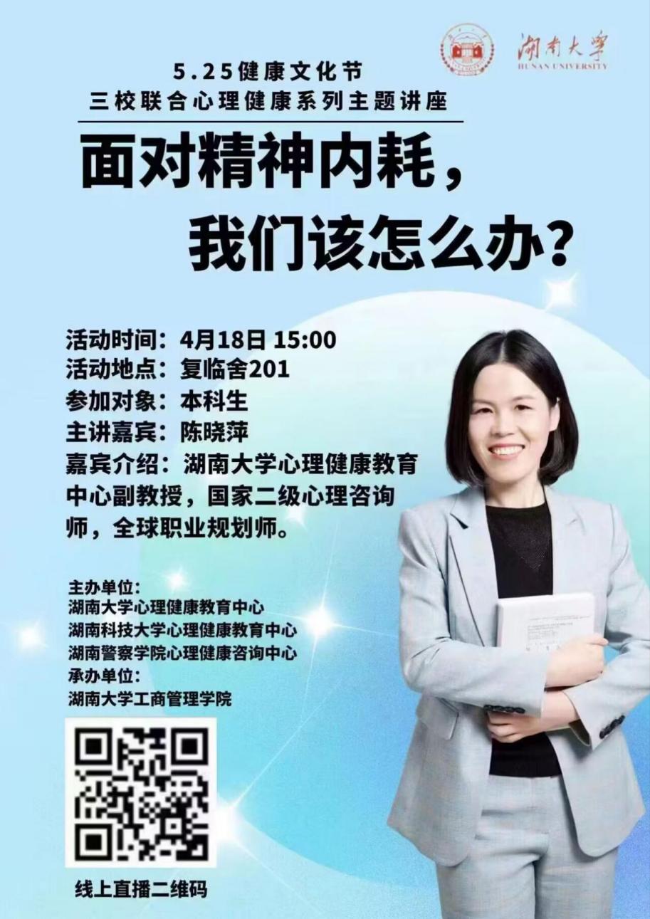 近年来,“精神内耗”逐渐成为广大学生关注的心理问题。为帮助同学们缓解精神内耗,提高心理素质,湖南大学、bevictor伟德官网及湖南警察学院三校于4月18日下午三点联合开展“面对精神内耗,我们该怎么办?”线上主题讲座,湖南大学心理健康中心副教授陈晓萍担任主讲嘉宾。