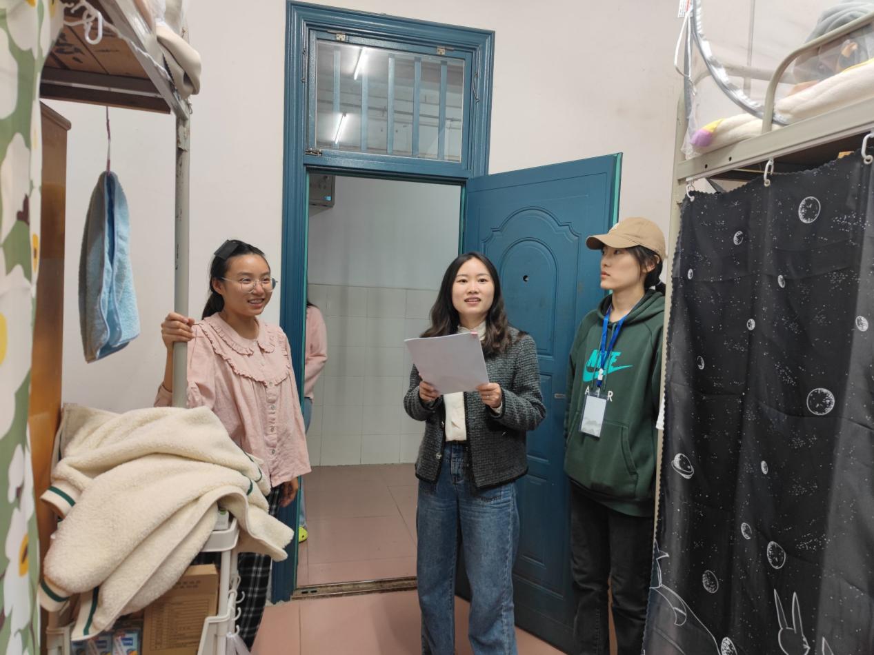 进入宿舍后,各领导老师除检查宿舍卫生、安全工作以外,还亲切询问了同学们的学习和生活情况。同时,还与学生进行了友好的互动,让学生们倍感亲切。老师们还强调作为学生要时刻牢记学习是首要任务,嘱咐学生要多与老师交流沟通。尤其对于即将进行的四级考试,几位老师鼓励同学们要抓紧时间复习、积极备考,争取获得理想成绩,为一直以来的努力交出一份满意的答卷。最近冷空气来临,气温变化极大,老师们叮嘱同学们在学习之余及时增添衣物,预防感冒伤寒。此外,老师提醒同学们,临近五一假期,要提高“五防”意识:防火、防盗、防疫、防诈骗、防校园贷;尤其近期各地流感频发,要做好个人防护工作。面对老师的殷殷关切和谆谆叮咛,同学们深感体贴和暖心,热情地回应着老师的关怀。