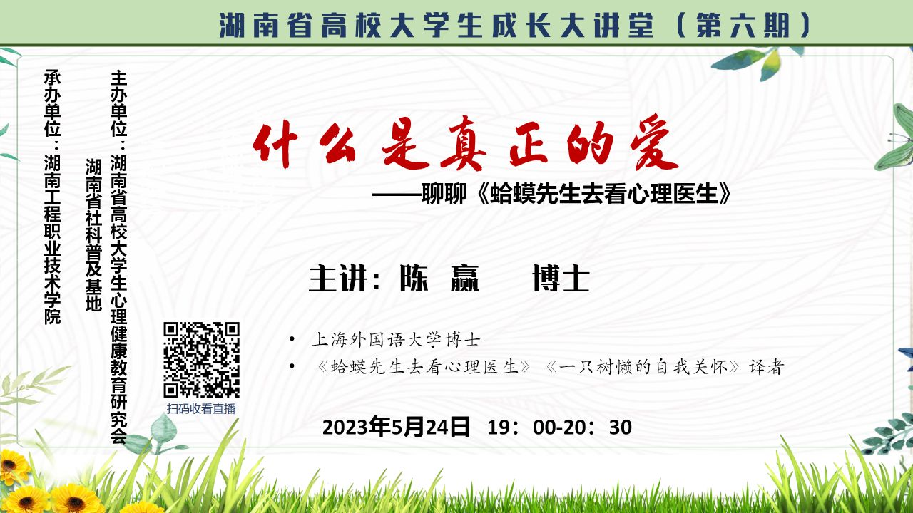 为了进一步做好大学生心理健康宣传普及教育,引导大学生勇敢探索自己的内心世界,我校特此组织全体大二学生于5月24日晚,观看“什么是真正的爱”为主题的线上直播讲座,本次讲座由《蛤蟆先生去看心理医生》的中文译者陈赢博士主讲。bevictor伟德官网积极响应学校号召,组织学生观看讲座,学习知识,并取得良好反响。