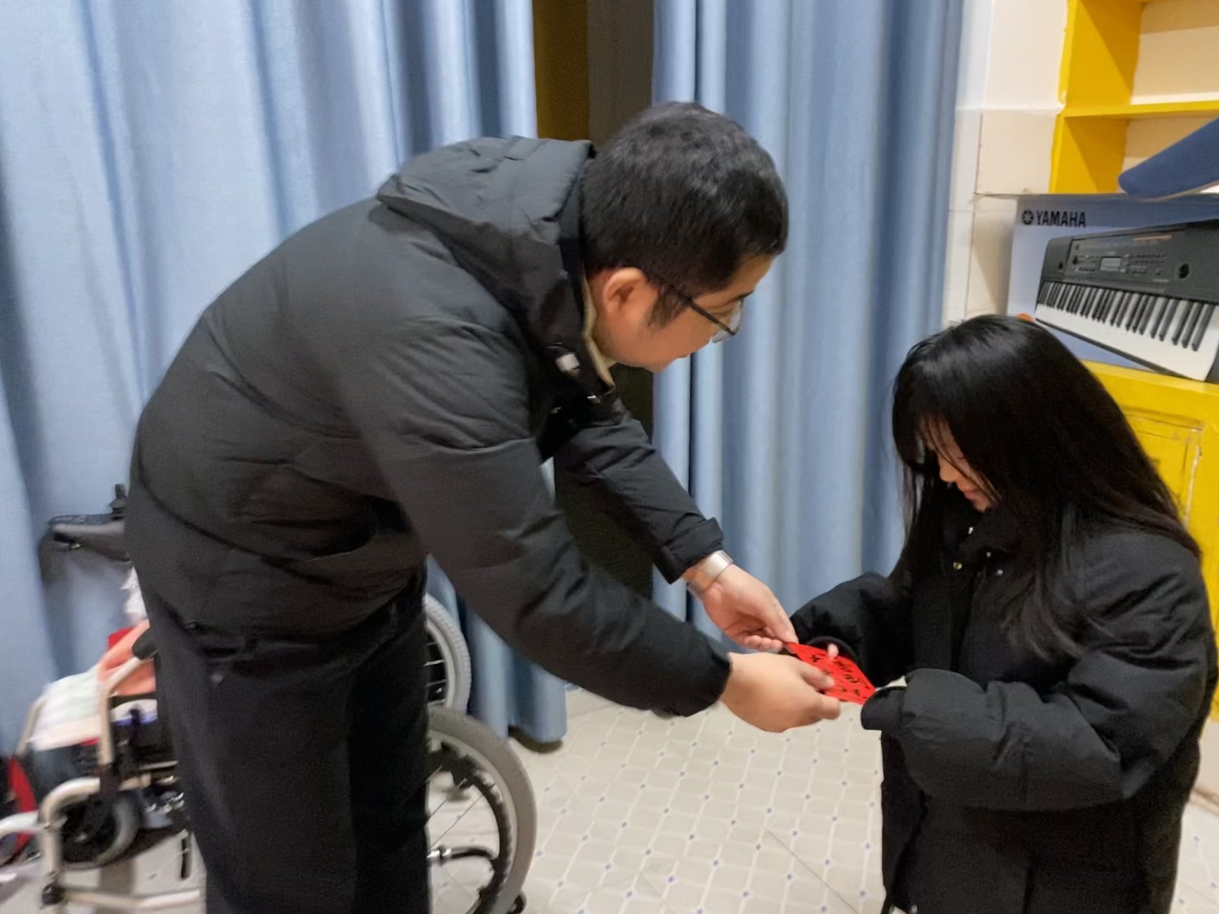 肖盼看到老师们到来,赶紧起身,热情的打招呼。邱书记关心地询问肖盼最近一段时间吃穿住行的细节,还细心提醒,雪天要注意防寒保暖,宿舍空调要利用起来,不要担心用电。叶书记补充道,免除宿舍电费手续已经办理好,安心搞好学习要紧。站在肖盼书桌前,邱书记担心窗前来往的行人会有干扰,贴心地说会找人安装新的窗帘。肖爷爷看到老师们事事为肖盼考虑周全,连声道谢。交谈过后,邱书记拿出准备好的红包,送到肖盼的手中,告诉她:法管学院的老师、同学们都很关心、记挂她,大家自发地为她募捐了一万多元,会分阶段以生活补贴的方式给她,希望这笔钱能够缓解她的经济压力,减少后顾之忧。
