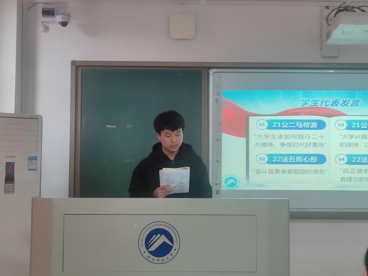 不仅老师倾情讲述,同学们也纷纷吐露心声。22级法学一班高迪同学围绕如何做新时代好青年这个主题,他表示:“作为法学生,我们应结合法学知识积极参与社会实践,主动承担社会责任,不做佛系青年,将青春的底色照耀人间社会,永怀初心,不断向上。”;22级法学二班唐熳同学则结合大热剧《狂飙》分享自己的心得体会,“尘雾之微,补益山海,荧烛末光,增辉日月,敢想敢做,勇于实践”是她对青年的诠释。诸多同学踊跃上台发言,有生活趣事,也有对大学生活的迷茫,有对上学期的学习生活的反思,也有不做躺平“咸鱼”的励志……这些发言无不引起了在座同学的共鸣。