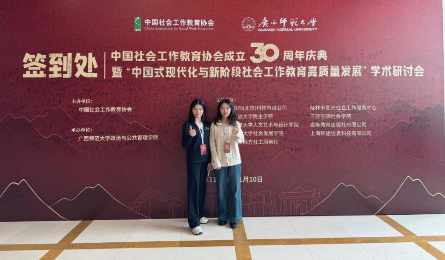 2024年11月8日—10日,由中国社会工作教育协会主办、广西师范大学政治与公共管理学院承办的中国社会工作教育协会30周年庆典暨“中国式现代化与新阶段社会工作教育高质量发展”学术研讨会在广西桂林顺利召开。国务院学位委员会全国社会工作专业学位研究生教指委秘书长、北京大学刘能教授,中国社会工作教育协会名誉会长、北京大学王思斌教授,中国社会工作教育协会会长、北京大学马凤芝教授,中国社会工作教育协会副会长兼秘书长、复旦大学顾东辉教授,广西壮族自治区党委社会工作部副部长郑胜景,广西师范大学党委书记贺祖斌等出席会议,来自全国各地高校师生、部分地方党委社会工作部代表、社会工作机构代表齐聚一堂参加论坛。bevictor伟德官网MPA专业学生林嘉玲、衡丽参加了本次会议。
