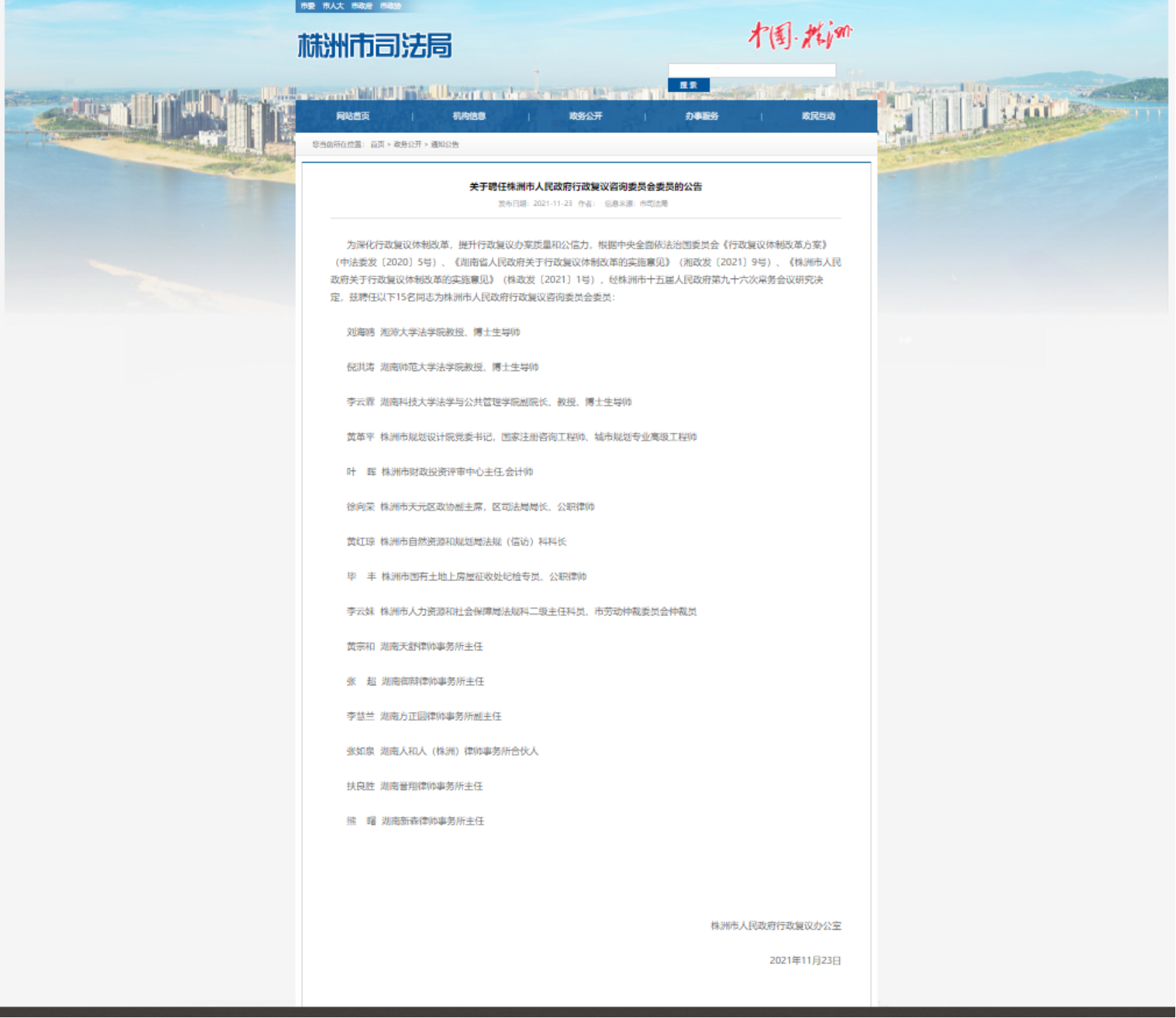 为深化行政复议体制改革,提升行政复议办案质量和公信力,株洲市人民政府根据中央全面依法治国委员会《行政复议体制改革方案》(中法委发〔2020〕5号)等文件精神,组建了株洲市人民政府行政复议咨询委员会。bevictor伟德官网李云霖教授被聘为株洲市人民政府行政复议咨询委员会委员。