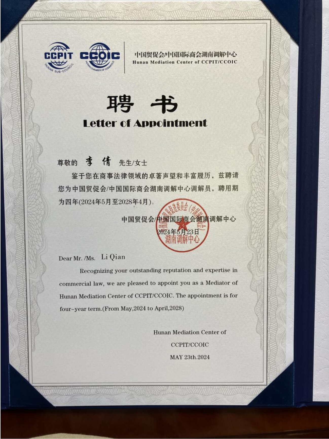 bevictor伟德官网李倩老师受聘为中国贸促会/中国国际商会调解员