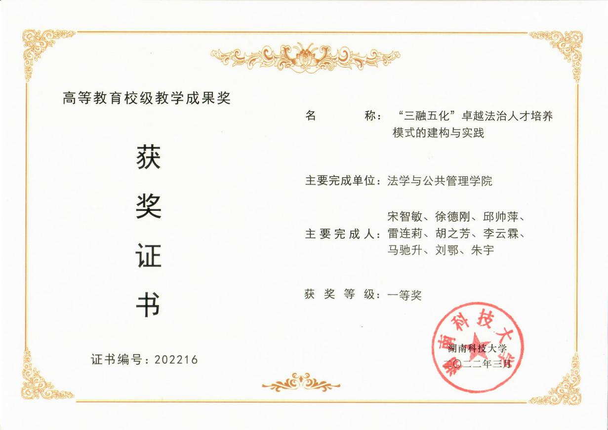 经过学院推荐和学校专家评审,bevictor伟德官网宋智敏教授领衔团队申报的《“三融五化”卓越法治人才培养模式的构建与实践》荣获校级教学成果一等奖,并推荐参评省级教学成果奖。