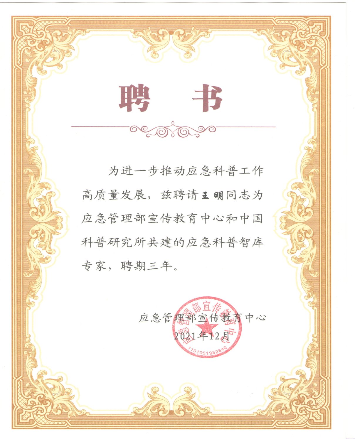 bevictor伟德官网王明副院长获聘应急管理部宣传教育中心应急科普智库专家