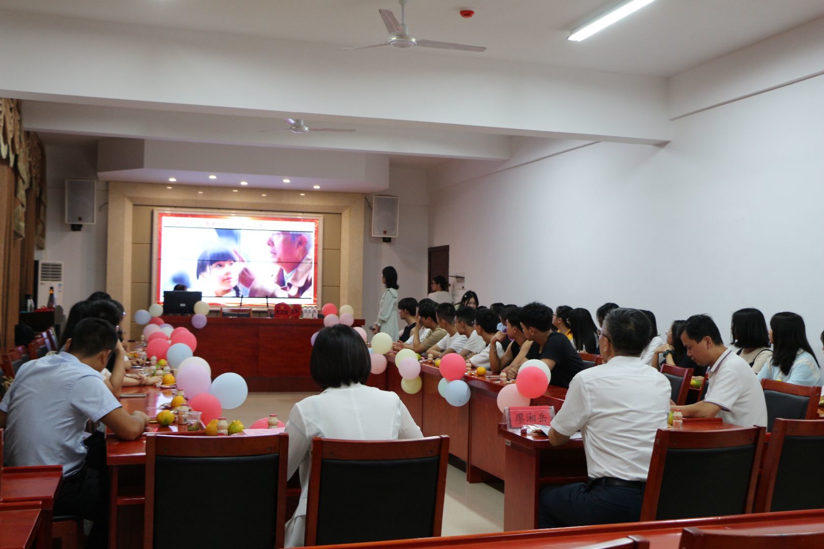首先,法学一班同学为到场老师献上一张张精心准备的贺卡。小小贺卡,要写的太多,能写的太少,能写下的是学生对老师最真诚的感恩与祝福,写不下的是学生与老师最难以割舍的师生情谊。学生送,送的是感恩与祝福,老师收,收的是感动与幸福。随后,师生一道观赏视频。在轻柔的音乐声里,大家一起回顾过去的一年的生活中的点点滴滴,感受着彼此从军训到课堂,从陌生到熟悉,从青雉到成熟的一次次蜕变。一幕幕温暖鲜艳的画面闪过,在大家平静的心海里漾起一波温柔的涟漪。