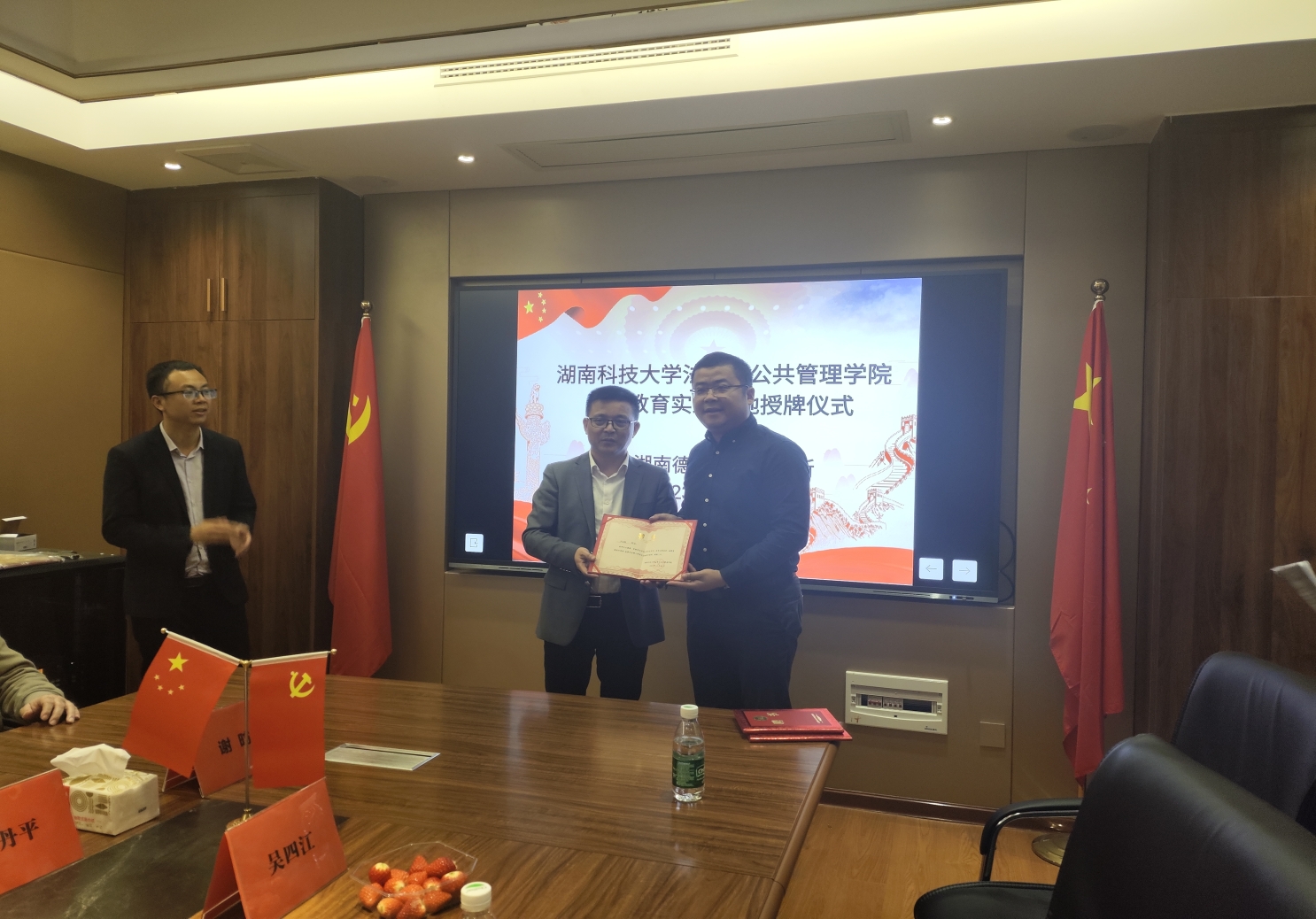 揭牌仪式后,邱帅萍院长向湖南德巍律师事务所各合伙人颁发了兼职导师聘书,三位受聘导师承诺将高度重视导师工作,真心服务学生,倾心关注学生,全心助力学生,不负学院与师生期望。