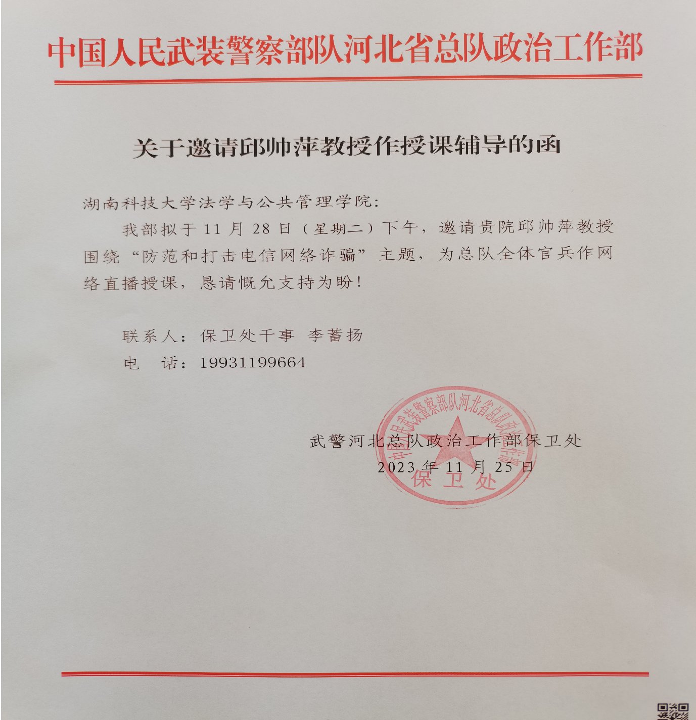 2023年11月28日(星期二)下午,中国人民武装警察部队河北省总队政治工作部邀请bevictor伟德官网邱帅萍院长围绕“防范和打击电信网络诈骗”主题,为总队全体官兵作网络直播授课,bevictor伟德官网院长邱帅萍教授应邀给官兵将近5000人线上授课。