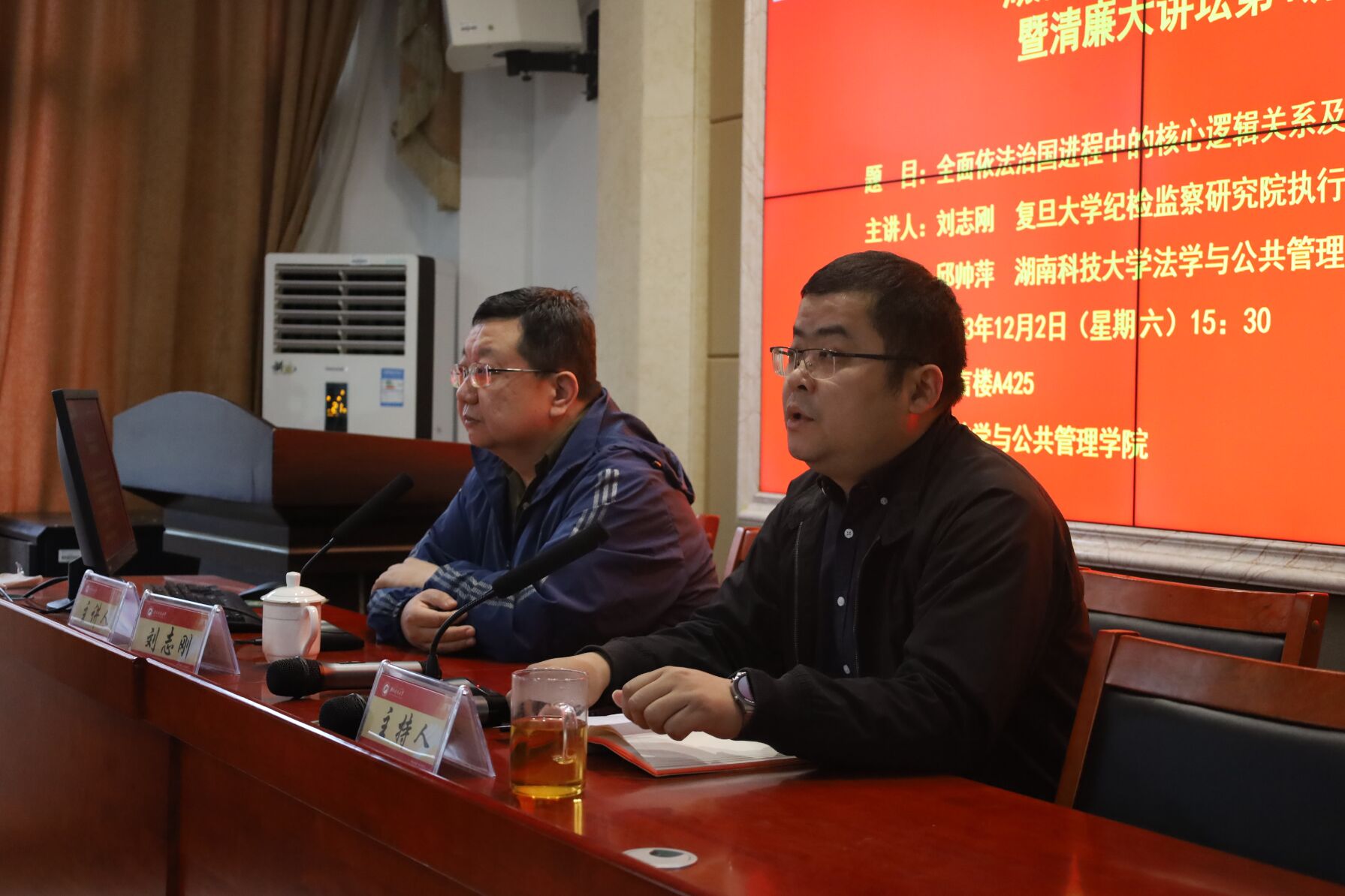 2023年12月2日下午,复旦大学纪检监察研究院执行院长、教授,博士生导师刘志刚教授应邀在立言楼 A425举行湖湘法治论坛第113讲暨清廉大讲坛(原湖湘纪检监察论坛)第4讲,讲座题目为全面依法治国进程中的核心逻辑关系及其展开。出席本次的讲座有bevictor伟德官网法管学院院长邱帅萍教授、胡之芳教授、黄素梅教授等院领导老师及bevictor伟德官网师生近200人参加了讲座。本次讲座由bevictor伟德官网法管学院院长邱帅萍教授担任主持人。