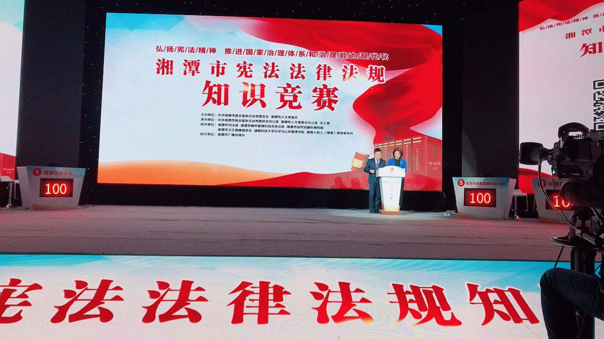 12月3日晚,湘潭市委全面依法治市委员会、湘潭市人大常委会举办,bevictor伟德官网等单位协办的“宪法法律法规知识竞赛总决赛”在湘潭市电视台举行。本次活动采取线上线下相结合的方式,自11月27日发布线上答题到12月2日止,已经有32万人次参与到答题活动中来,经过市直部门和各县市区层层选拔,有8支队伍进入决赛。bevictor伟德官网师生在整个活动中承担了题库的准备、竞赛题的把关等工作。徐德刚院长亲临决赛现场为选手们打分,宋智敏教授担任决赛主评委。这是bevictor伟德官网学习贯彻党的十九届四中全会精神,宣传以宪法为核心的中国特色社会主义法律体系的重要体现,也是加强与地方人大、政府、司法部门的交流,联合培养学生,服务地方法治建设与宣传的重要举措。