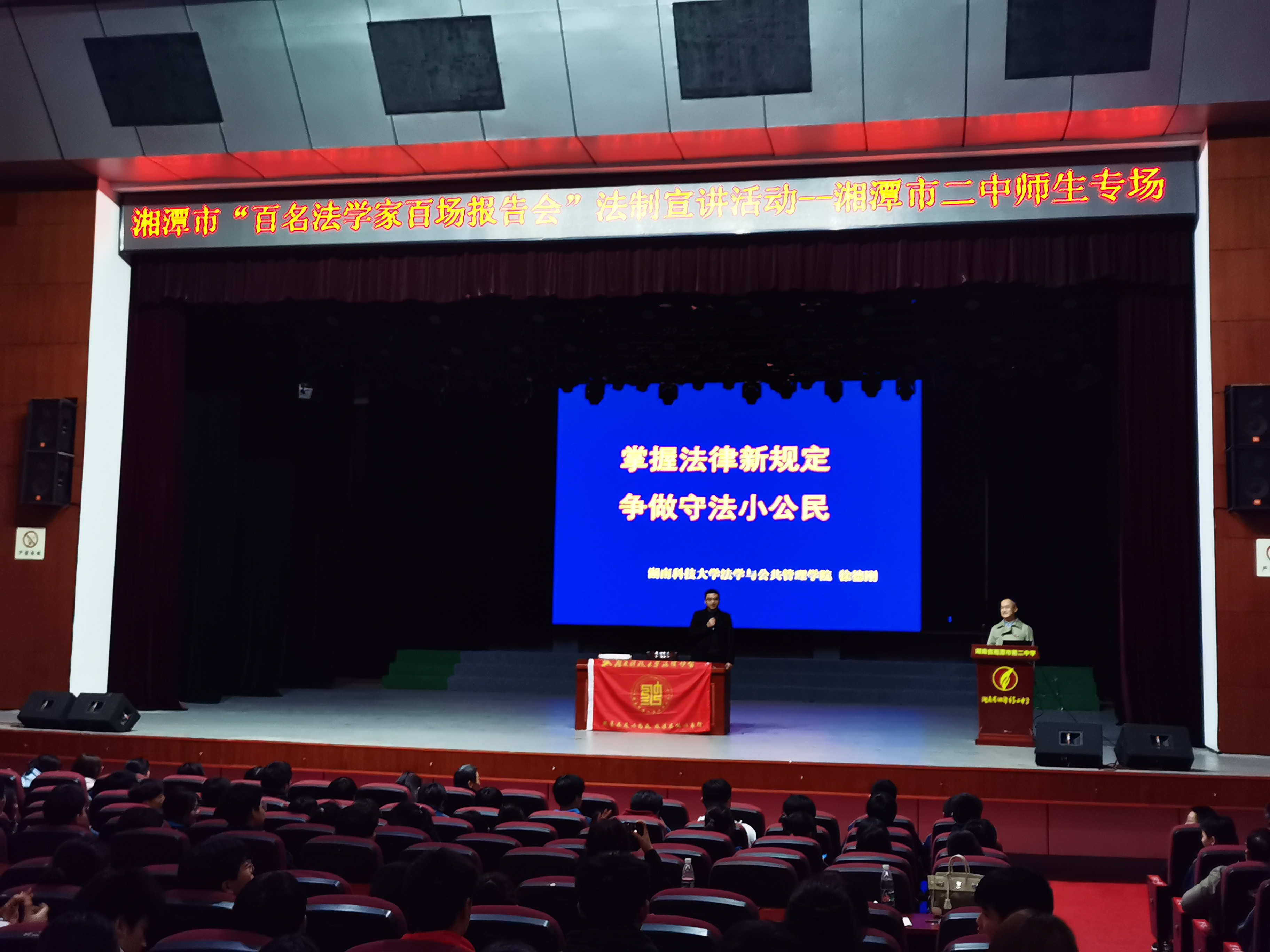为深入学习、宣传和贯彻习近平法治思想,增强中学师生法治意识,2023年03月23日,湘潭市“百名法学家百场报告会”法治宣讲活动——-湘潭市二中师生专场于下午4:30在湘潭市二中艺术楼三楼演艺大厅举行。bevictor伟德官网徐德刚教授带领bevictor伟德官网法律协会三位同学冒雨深入学校开展了普法宣讲,湘潭市二中初一、高一部分学生及相关教师共700余人参加。