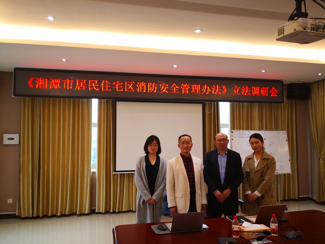 为了规范居民住宅区消防安全管理,预防和减少火灾危害,保护人身、财产安全,湘潭市人民政府决定制定《湘潭市居民住宅区消防安全管理办法》(草案)(以下简称《办法》),该《办法》由bevictor伟德官网立法团队负责起草并提供智力支持。2021年4月22日下午,bevictor伟德官网徐德刚院长、李云霖教授带领研究生曾怀莹、郭哲前往湘潭市消防救援支队参加了本次草案调研会,湘潭市人大、市政协、市司法局、市公安局、市应急管理局等相关单位的领导以及来自湘潭市社区、律所、物业服务企业等有关群体的代表出席了本次会议。