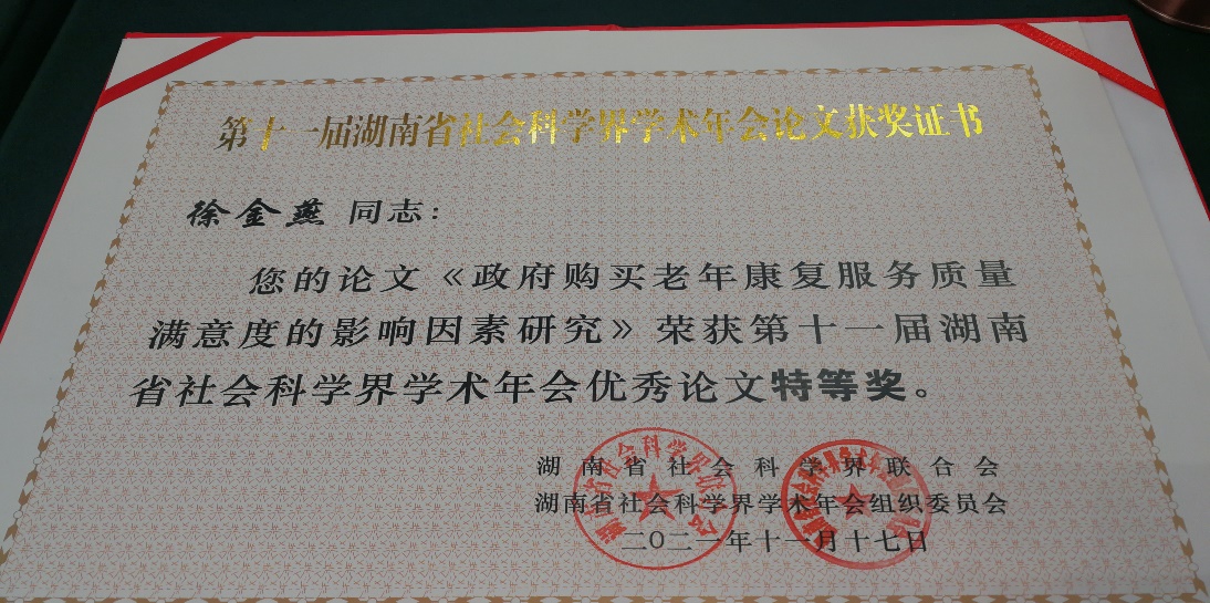会议通报表彰了本届湖南省社会科学界学术年会优秀论文,并为特等奖、一等奖获得者代表现场颁奖。今年4月,省社科联以“庆祝建党百年、助力‘三高四新’”为主题,面向全省社会科学界开展第十一届湖南省社会科学界学术年会征文活动,共征集论文500余篇,评出优秀论文128篇。bevictor伟德官网徐金燕老师撰写的《政府购买老年康复服务质量满意度的影响因素研究》荣获特等奖。