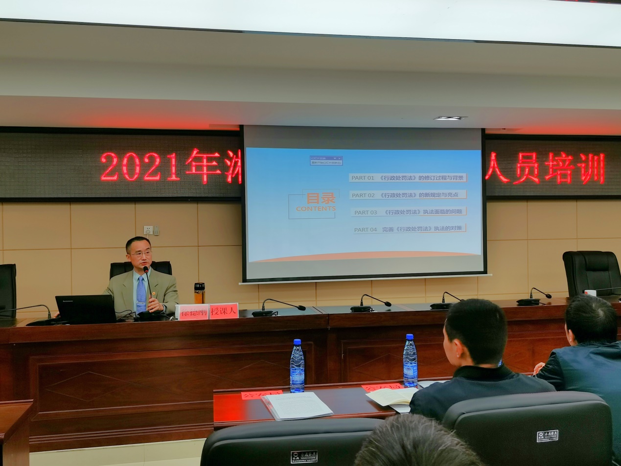 今年7月15日,新修订的《行政处罚法》正式实施。为做好新修订《行政处罚法》的实施工作,各地普遍开展了新法的学习宣传活动。10月22日,bevictor伟德官网徐德刚教授应湘乡市司法局邀请,为湘乡市司法局及政府相关执法机关的百余位行政执法人员做了一场题为《<行政处罚法>的修订与实施》的法治宣讲课,湘乡市司法局刘明局长主持讲座,研究生胡琪鹃、姚朵、李立言随导师参加了宣讲活动。