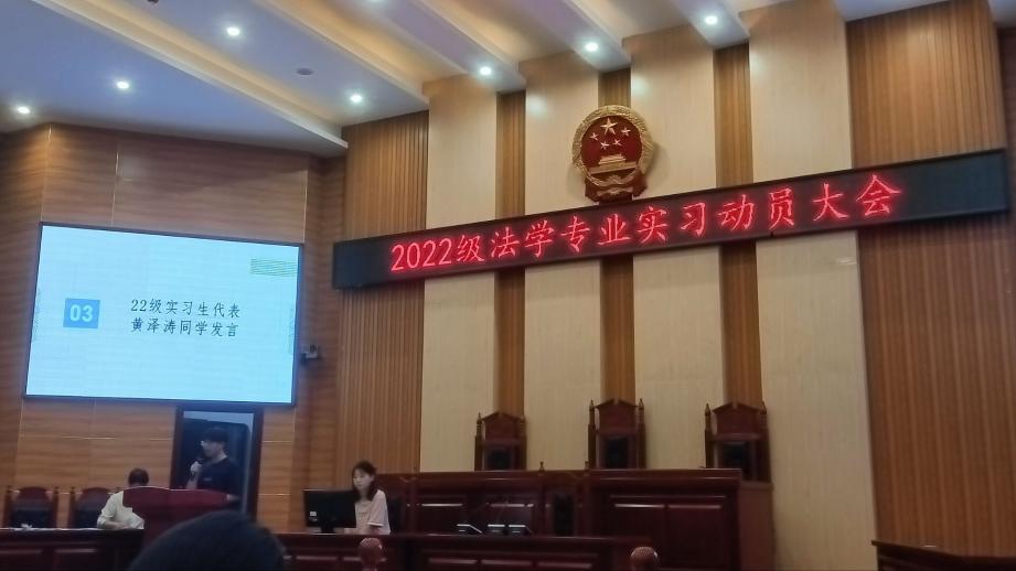 学生代表黄泽涛同学代表22级全体同学向学院以及全体法学专业老师致谢,感谢老师们为我们提供了如此宝贵的实习机会,同时他呼吁大家要在实习的过程中迎接挑战,不断学习、成长,积累实践经验,珍惜这次的实习机会。