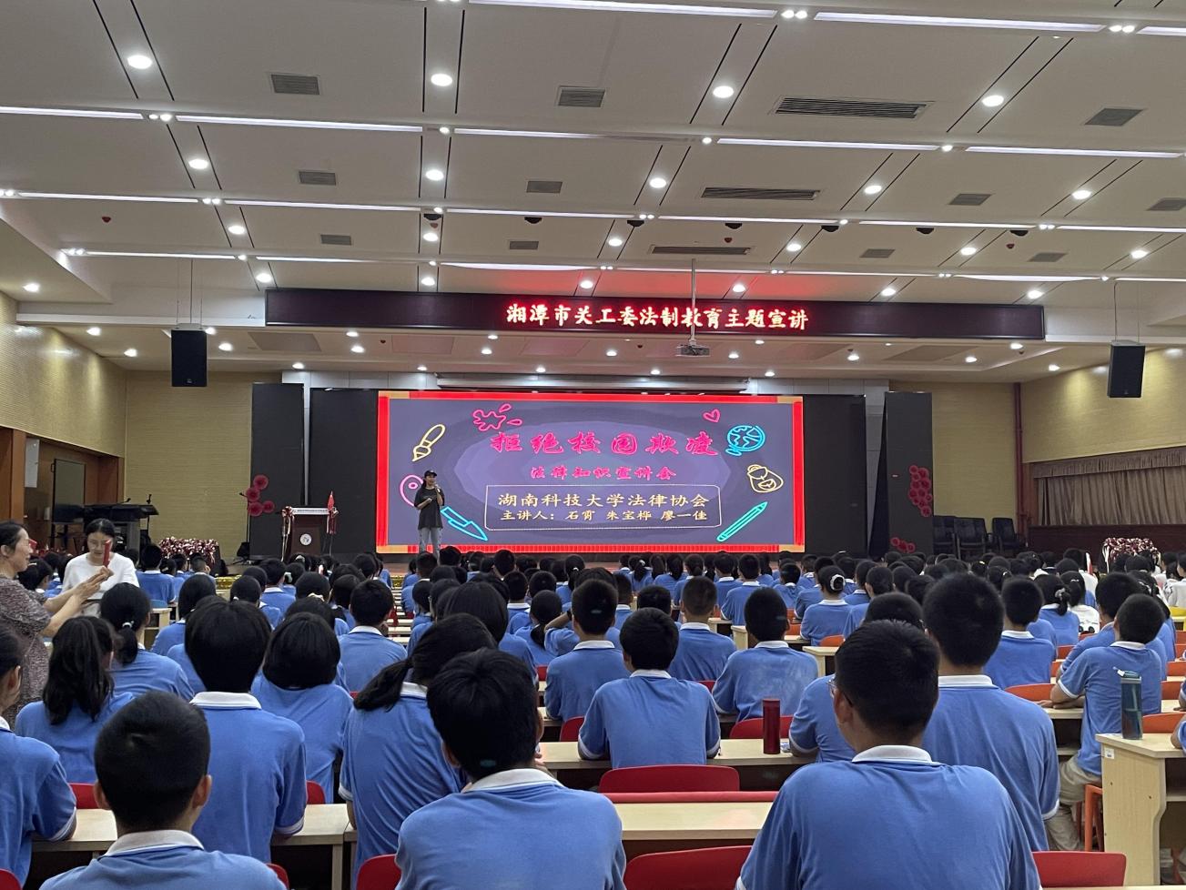 2021年9月,《湖南省法制宣传教育条例》正式施行10周年,为做好宣传贯彻,增强青少年法治观念,2021年9月15日晚,bevictor伟德官网法律协会再次应邀在湘潭市示范性综合实践基地进行了以“拒绝校园欺凌”为主题的普法宣讲。教育基地的近500余名学生、部分老师参加了此次宣讲活动。