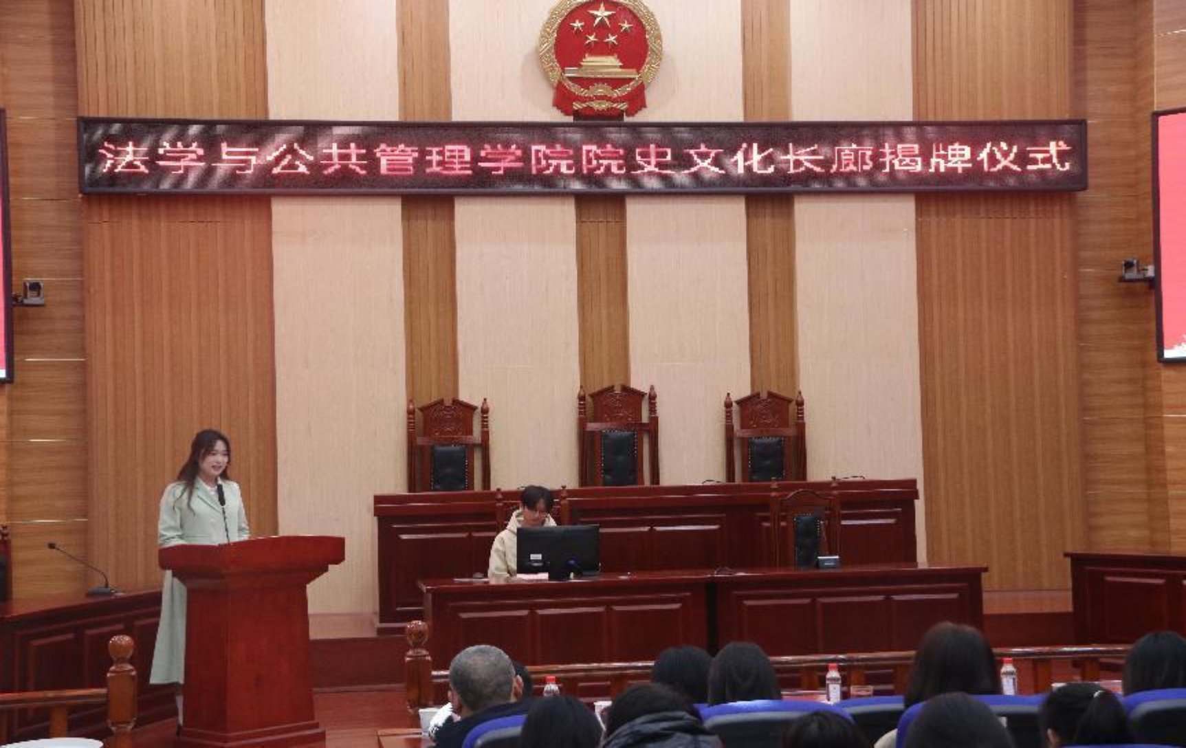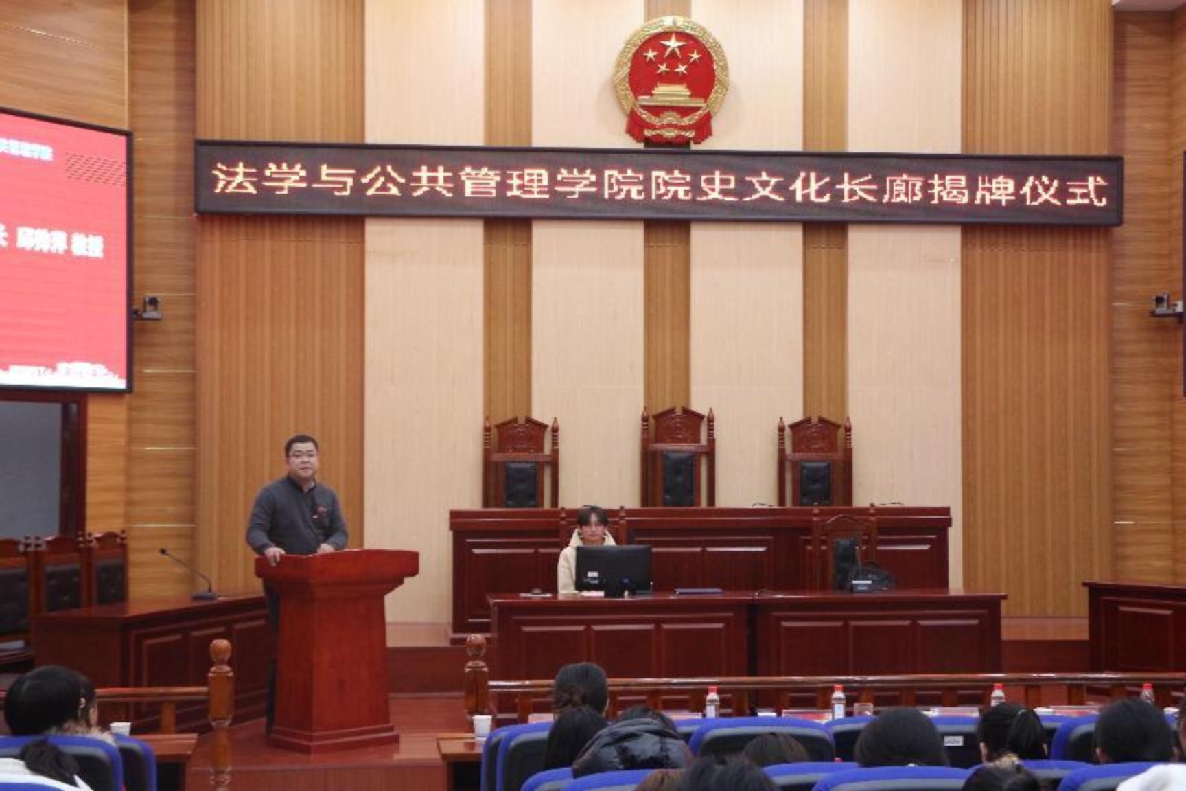 为了全面、真实反映学院的发展过程和办学成就,集中、完整展示学院的奋斗历程和精神风貌;铭记历史、汲取力量,以文化人、以文育人;展现校友风采,讲好法管故事,传承法管精神,更好地发挥文物和珍贵史料在院史学习教育中的重要作用,bevictor伟德官网于2023年12月28日下午在立言楼A3-2模拟法庭隆重举行了院史文化长廊揭牌仪式及校友系列活动。院党委副书记范军豪担任主持,bevictor伟德官网党委委员、副校长谢慧,全体院领导,系所室主任,校友代表,学院师生代表热情洋溢、踊跃参与了此次活动。