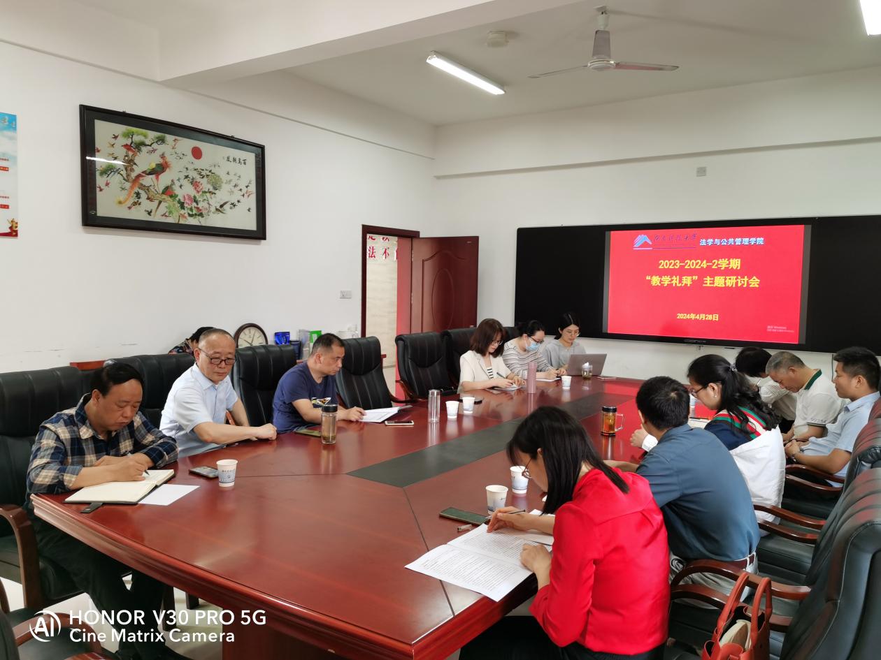 4月28日上午,法管学院在立言楼A427召开2023-2024学年第二学期“教学礼拜”专题研讨会,会议由教学副院长王明主持,院党委书记郑海祥、副书记范军豪、法律服务中心主任马驰升、校教学督导胡正昌,以及系主任、实验中心主任、学工办主任、教务办主任和教师代表参会。