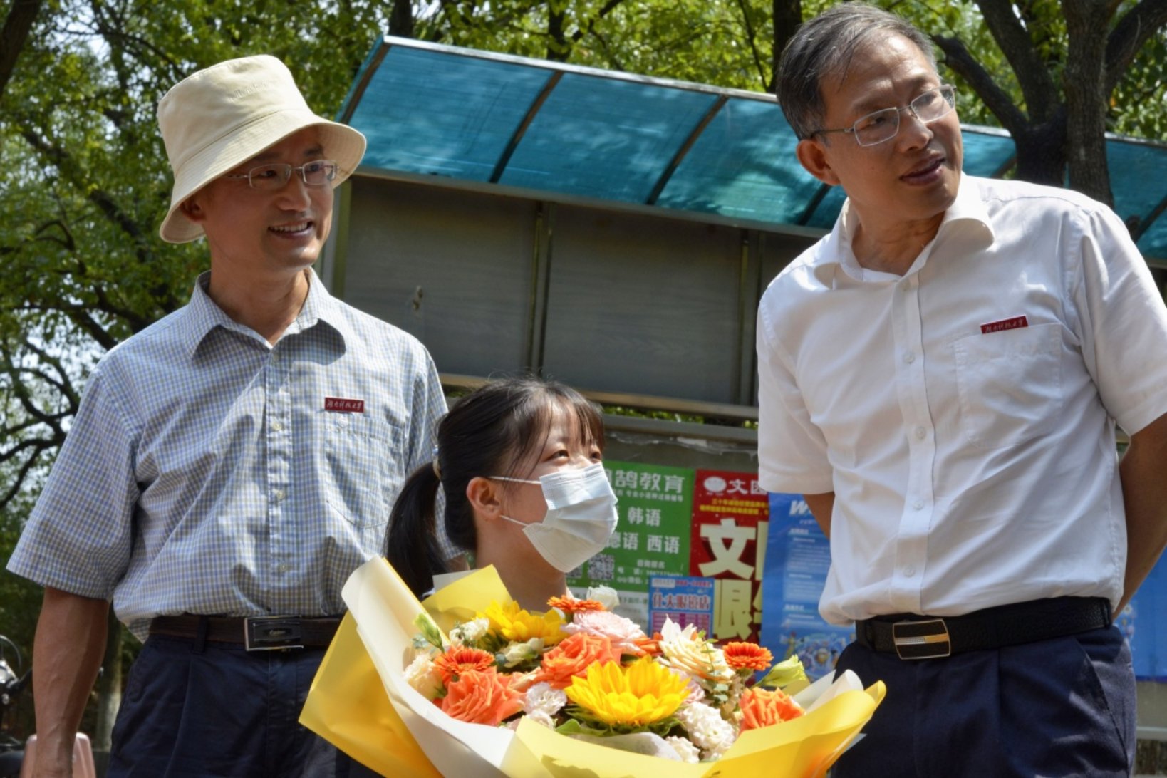 2021年9月16日中午,一辆皮卡车停在北校女生宿舍区,肖盼和邻居肖爷爷抵达学校,校党委书记唐亚阳特意带领相关职能部门负责人、法管学院全体院领导、辅导员、助班一行人在宿舍楼外迎接,并送上鲜花。唐亚阳书记细心地询问肖盼的身体状况,并和她热情交流,“欢迎你成为科大的一份子,以后科大就是你的家,我们都是你的家人,希望你能在科大健康快乐地成长!”他勉励肖盼在未来的大学生活中,要坚强勇敢,好好接受治疗,刻苦学习,在科大成长成才。