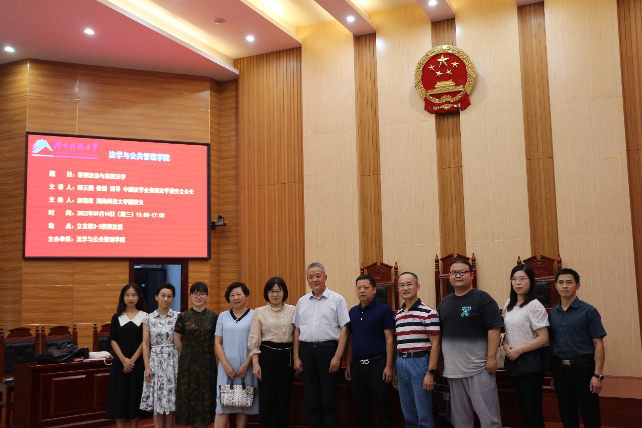 2022年9月14日下午,bevictor伟德官网湘江高端学术论坛在立言楼模拟法庭举办。中国法学会案例法学研究会会长、最高人民法院二级大法官、最高人民法院审判委员会原副部级专职委员胡云腾教授应邀出席论坛并做“案例法治与案例法学”主题讲座。