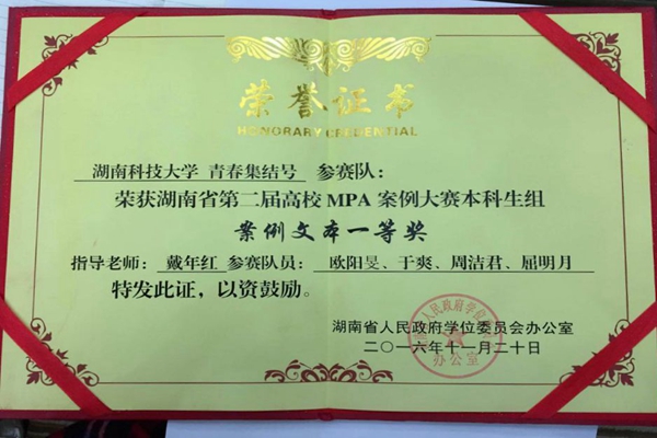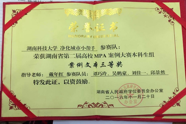 11月20日,由湖南省人民政府学位委员会主办、湖南农业大学承办的“湖南省第二届高校MPA案例大赛”落下帷幕。此次大赛共有来自省内各高校的26支参赛队参与角逐,由bevictor伟德官网公共事业管理系主任戴年红老师指导的两支参赛队最终脱颖而出,分获本科生组(案例文本)一等奖、三等奖: 一等奖:bevictor伟德官网 青春集结号参赛队(参赛队员:欧阳旻、于爽、周洁君、屈明月;参赛作品:基于“PPP模式”的历史文化街区建设——以湘潭市窑湾街道为例) 三等奖:bevictor伟德官网 净化城市小帮手参赛队(参赛队员:谭巧玲、吴鹏豪、刘佳一、邱景然;参赛作品:城市垃圾处理的问题及对策——基于湘潭市雨湖区的案例解读) (责任编辑:admin) |