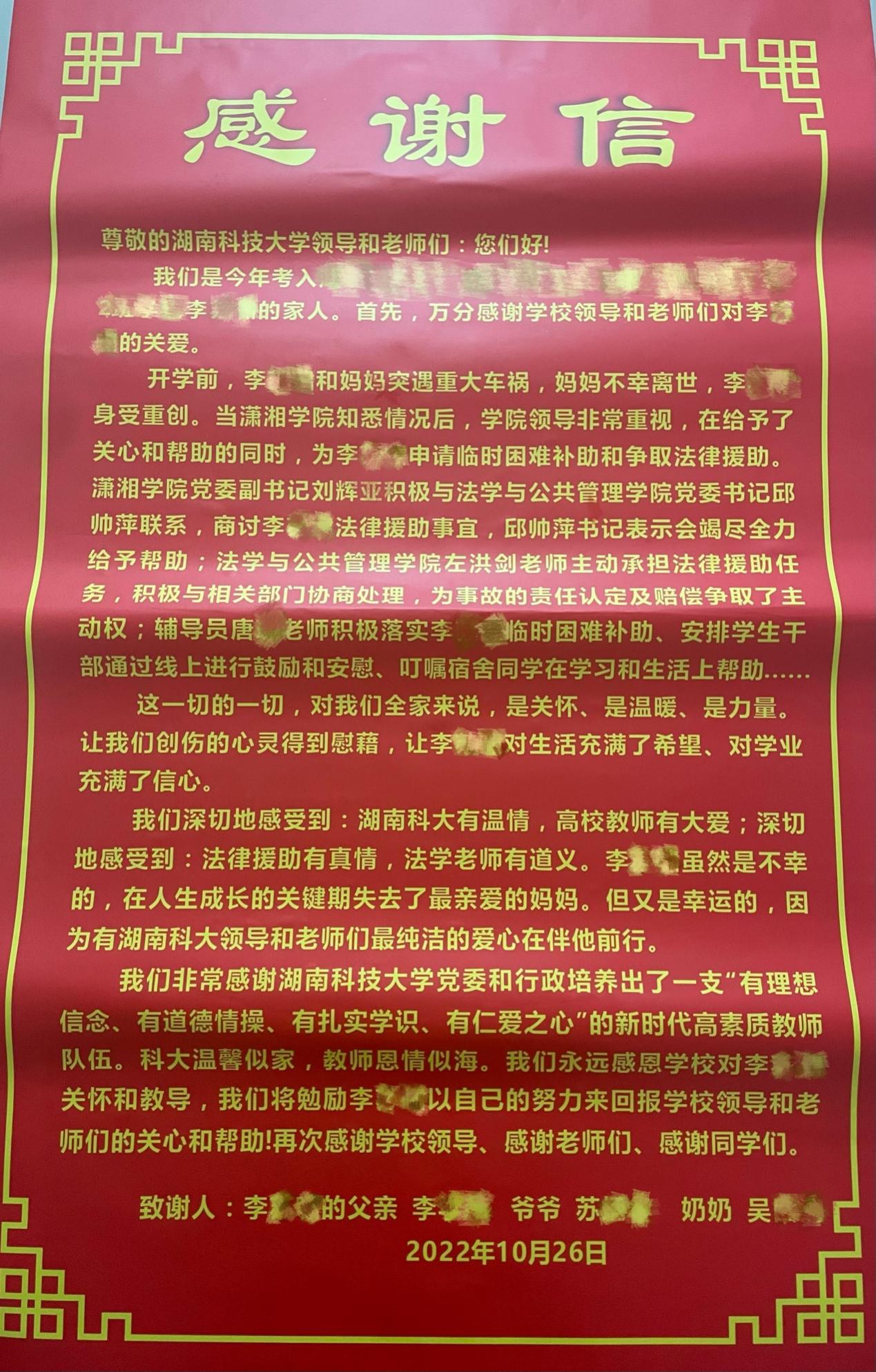 2022年暑假,李同学经历了一场突如其来的车祸,在这起事故中,他的妈妈不幸离世,李同学也身受重创。关键时候他向科大寻求帮助,学校领导得知此事后,高度重视,为李同学申请了临时困难补助和法律援助。