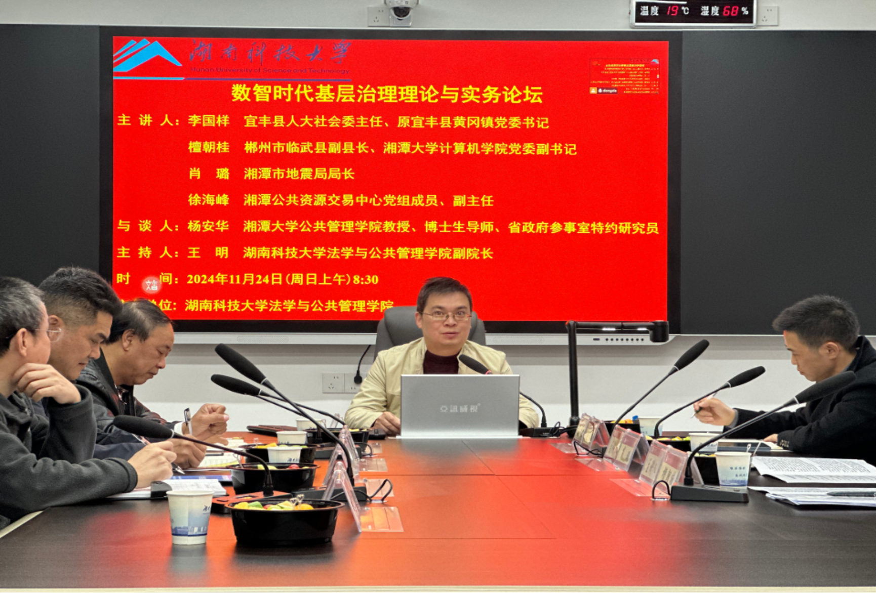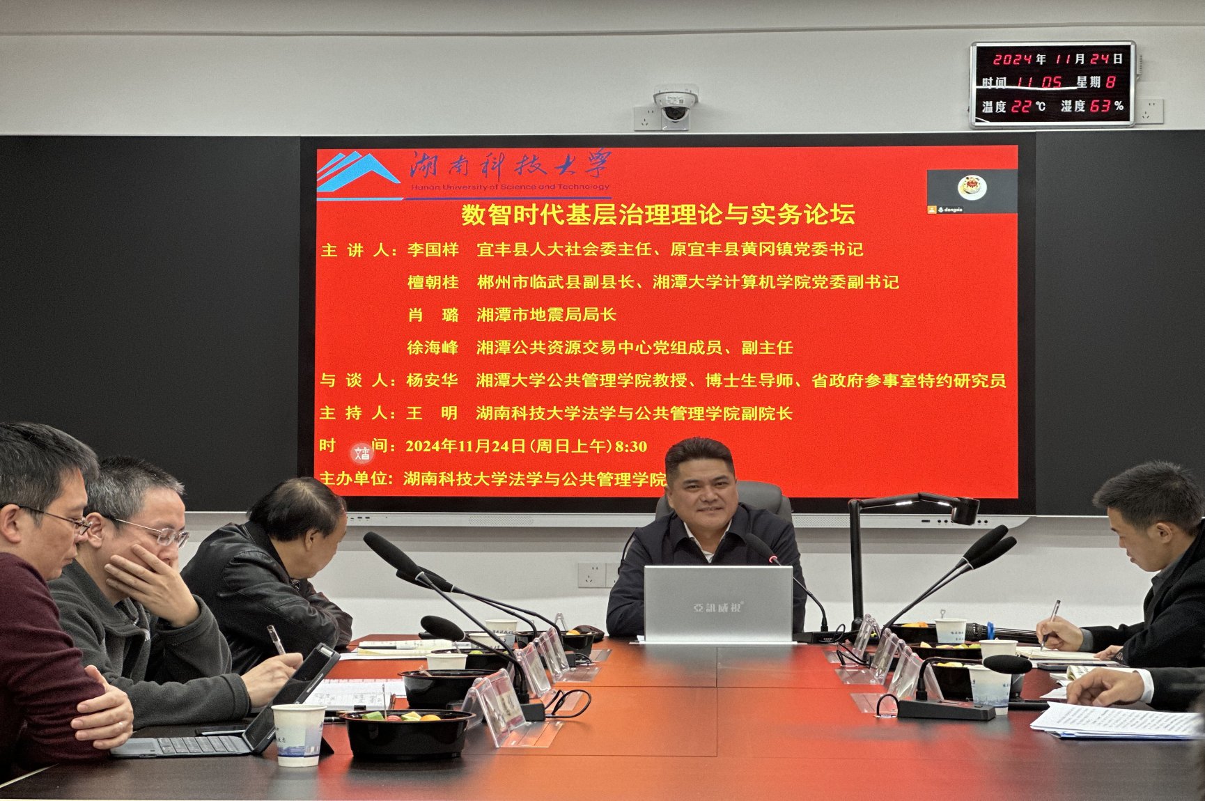 2024年11月24日上午,bevictor伟德官网,bet伟德官方网站在立言楼A303成功举办了“数智时代基层治理理论与实务”学术论坛。此次论坛邀请了江西省宜丰县人大社会委主任李国样、湖南省临武县副县长(挂职)檀朝桂、湖南省湘潭市地震局局长肖璐、湖南省湘潭市公共资源交易中心副主任徐海峰等人担任主讲嘉宾,湘潭大学公共管理学院教授、博士生导师、省政府参事室特约研究员杨安华担任与谈人,学院副院长王明担任主持人。全院近70名师生参与论坛。