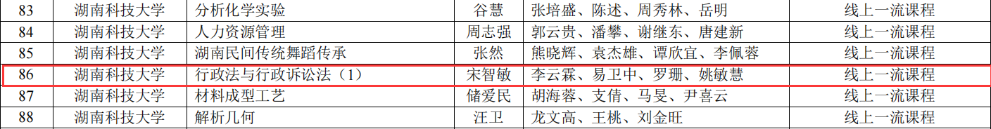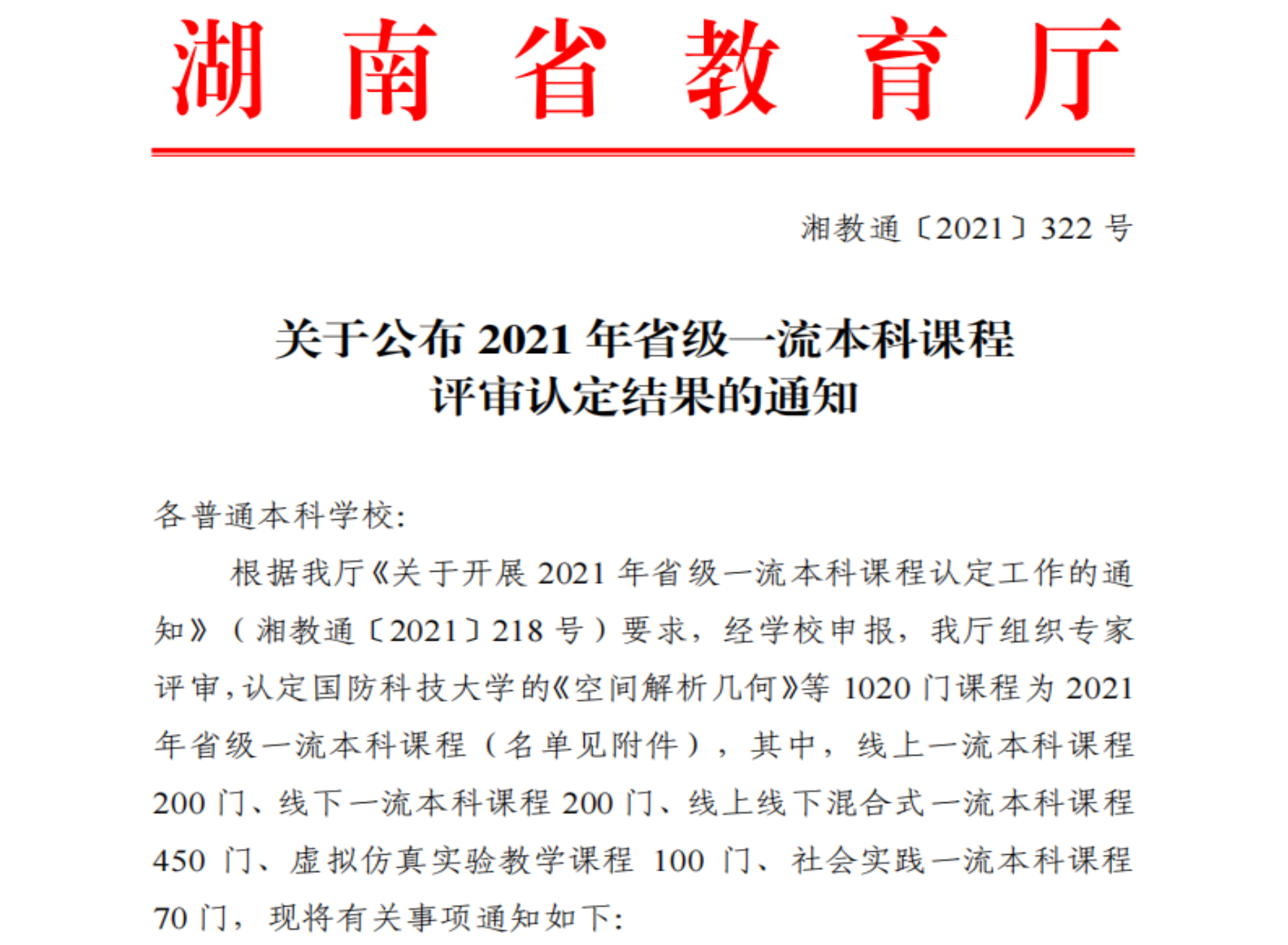 本次共认定 1020门课程为湖南省一流本科课程。其中,线上一流课程200门,虚拟仿真实验教学一流课程100门,线下一流课程 200 门,线上线下混合式一流课程450门,社会实践一流课程 70 门。bevictor伟德官网共有44门课程入选“省级一流本科课程”。